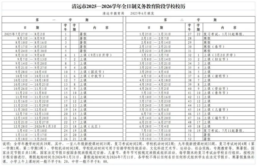 广东清远市义务教育全学年教学时间共39周,寒假开始时间为2026年2月1日,2026年3月2日开学。
